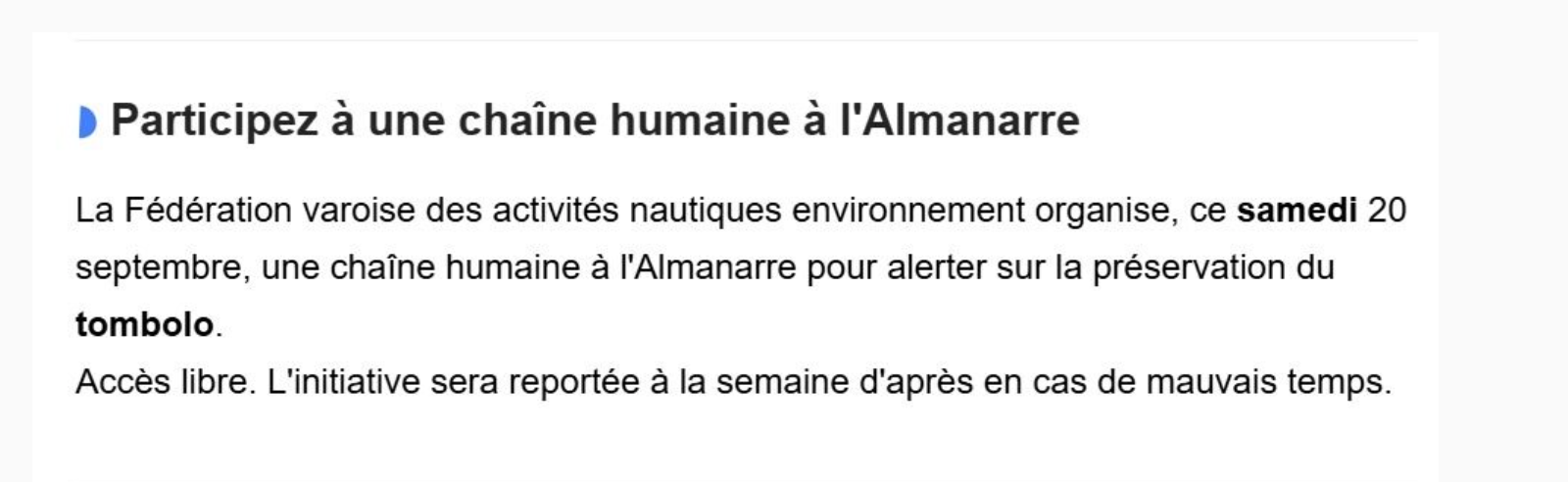 Je suis également très favorable à votre proposition de créer des accès supplémentaires à la plage de l’Almanarre pour les personnes à mobilité réduite ; je vous indique néanmoins qu’il en existe déjà, même si du côté de l’Almanarre Nord une eau trop profonde à quelques mètres du bord ne permet pas cette installation.